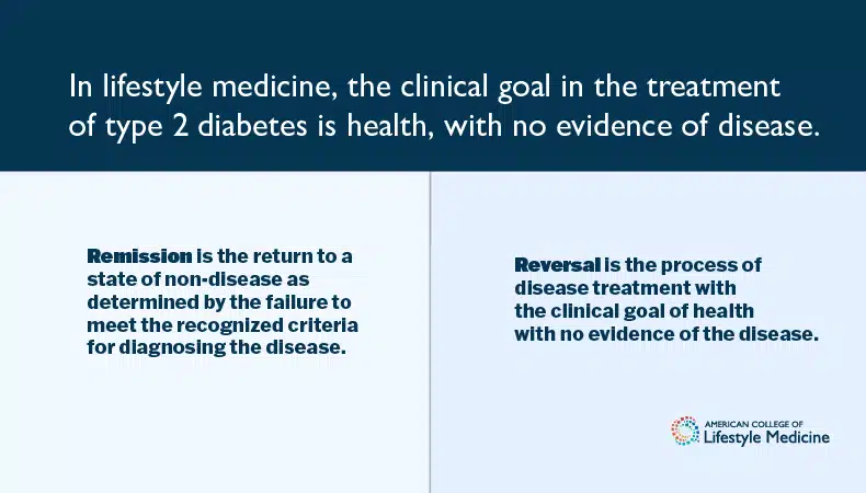 In lifestyle medicine, the clinical goal is health with no evidence of disease. Remission is the return to a state of non-disease as determined by the failure to meet the recognized criteria for diagnosing the disease. Remission does not necessarily equate to a state of no evidence of disease. For example, a return to glucose levels in the range of “prediabetes” are consistent with various definitions of remission of type 2 diabetes but are not adequate to meet criteria for no evidence of disease.